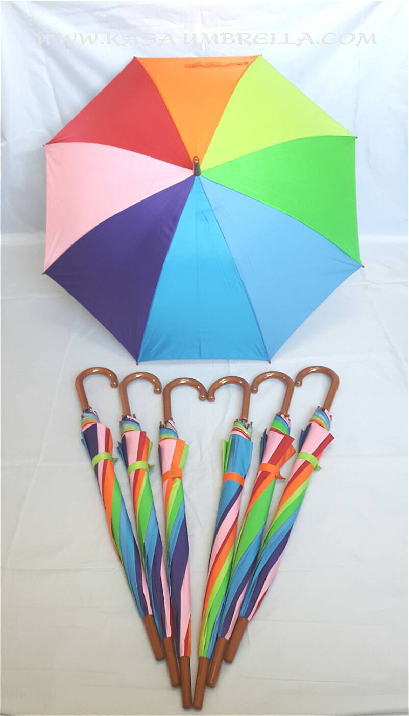 ร่ม 22นิ้ว เปิดออโต้ แกนเหล็ก10มิล ซี่ 8ก้าน ผ้าสีรุ้ง(ยูวีใน) ด้ามพลาสติกงอลายไม้