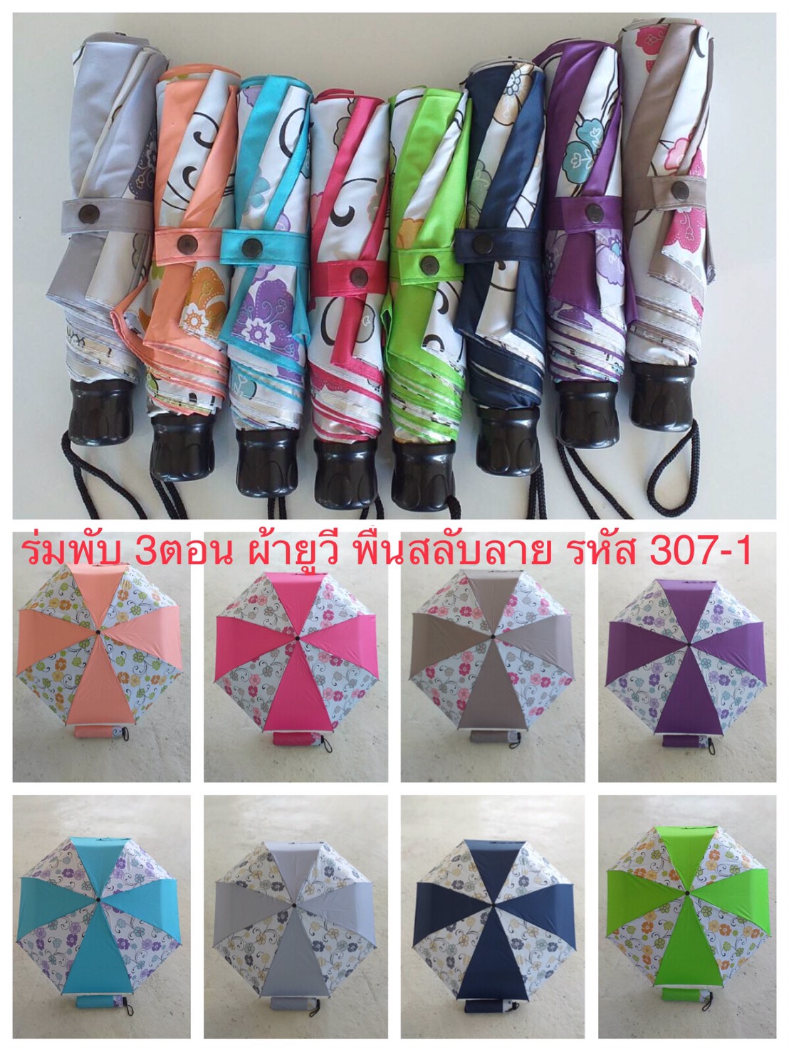 ร่มพับ 3 ตอน มือกาง แกนเหล็ก ซี่ 8 ก้าน ผ้าสีพื้นสลับลายดอก(เคลือบยูวีสีเงิน) ด้ามพลาสติก